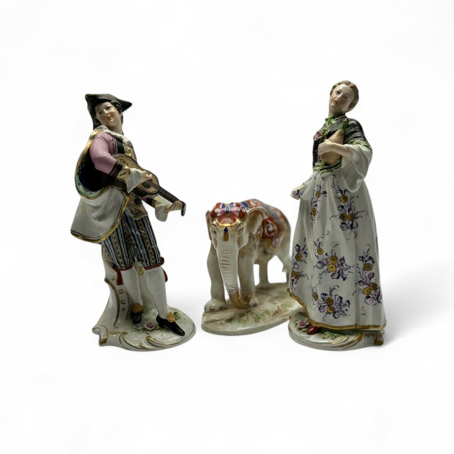 Lot van drie porseleinen sculpturen: een muzikant en vrouw met kruik, gemerkt Hochst. Met daarbij een olifant, gemerkt Capodimonte.
