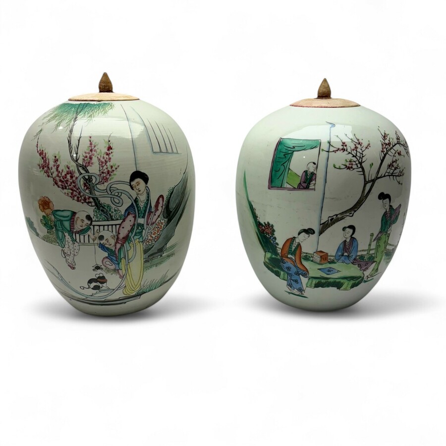Lot van twee antieke 19e eeuwse Chinees porseleinen gemberpotten met beschilderingen van figuren in een tuin, aan de achterzijde gemerkt met karaktertekens. Met houten deksels.