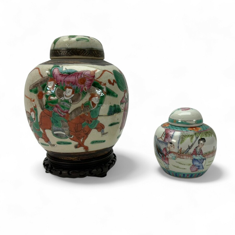 Lot van twee 20e eeuwse Chinees porseleinen gemberpotten: één Famille Rose en één Nanking. In goede staat.