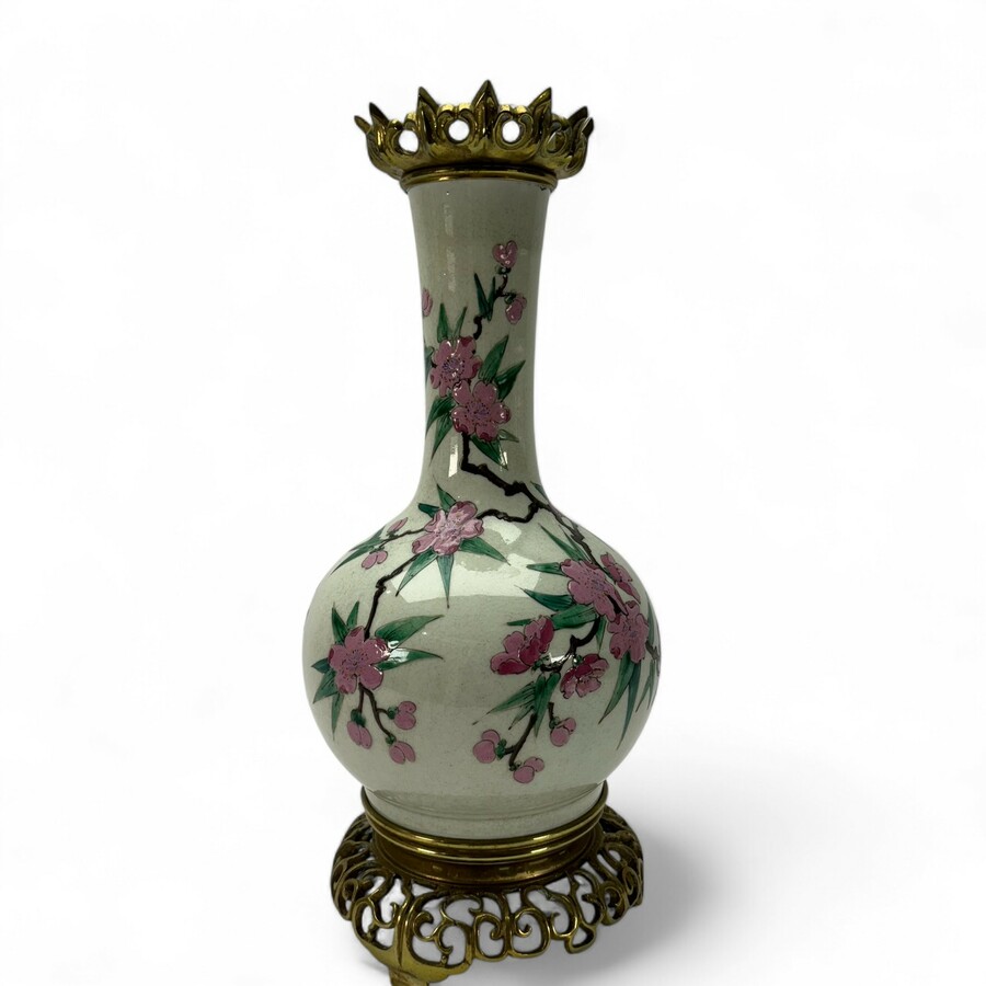 Een antieke Japanse of Chinese vaas, ca. 1900. Met bronzen montuur, ooit verbouwd tot olielamp