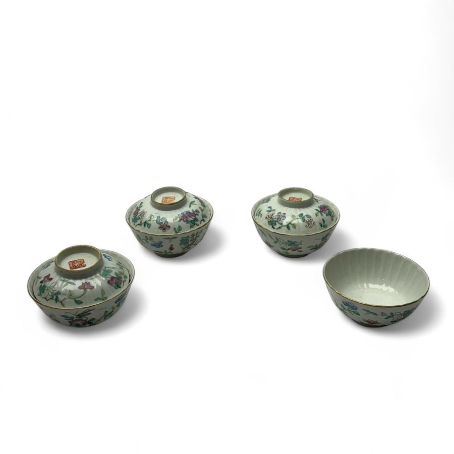 Lot van vier 19e eeuwse Chinees porseleinen Famille Rose rijstkommen, met floraal decor. Met daarbij drie deksels, gemerkt met zegelmerk. Conditie: goede staat, zonder grote beschadigingen.