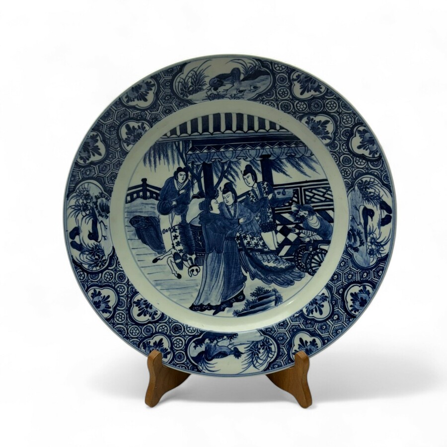 Een 20e eeuwse Chinees porseleinen schotels, onderglazuur blauw-wit gedecoreerd met op het plat voorstelling van dames bij een paviljoen, de randen versierd met geometrische motieven en medaillo...