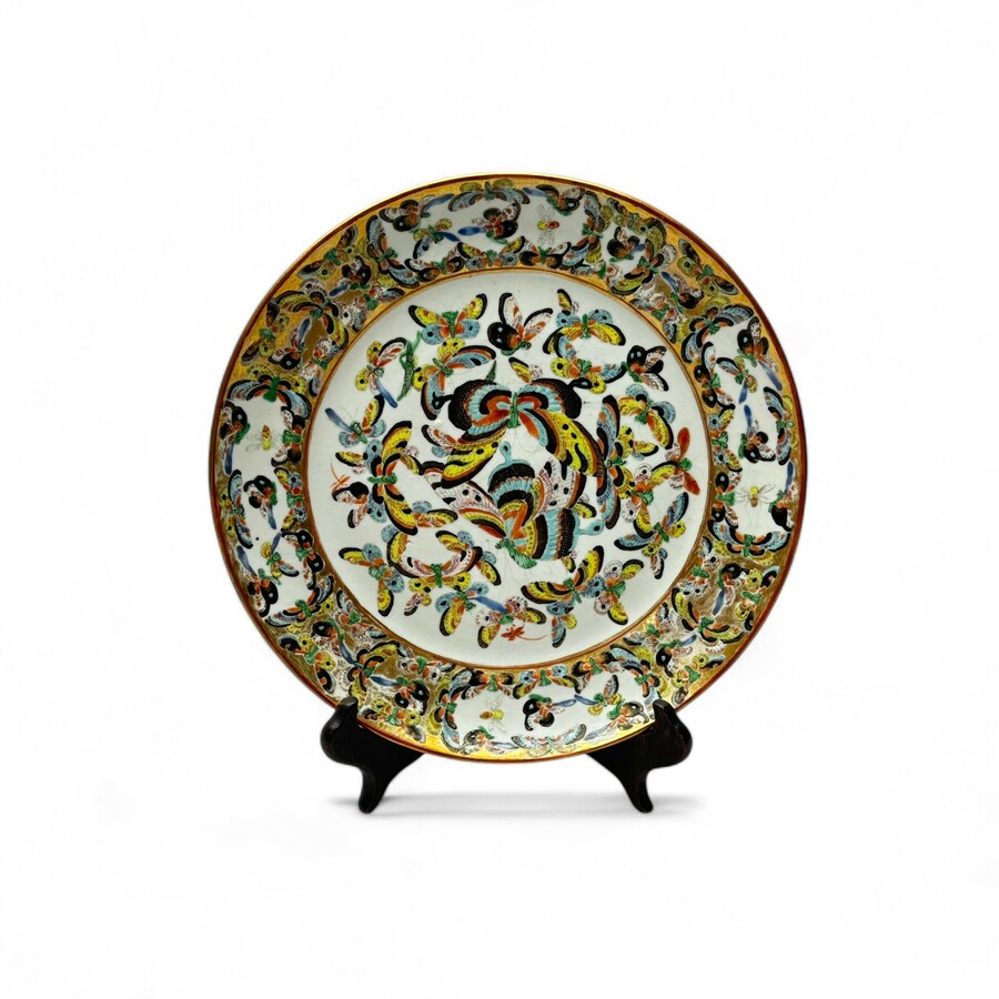 Een antiek laat 19e eeuws of vroeg 20e eeuws Chinees porseleinen bord, Kantonees, gedecoreerd met vlinders op het plat en de rand.