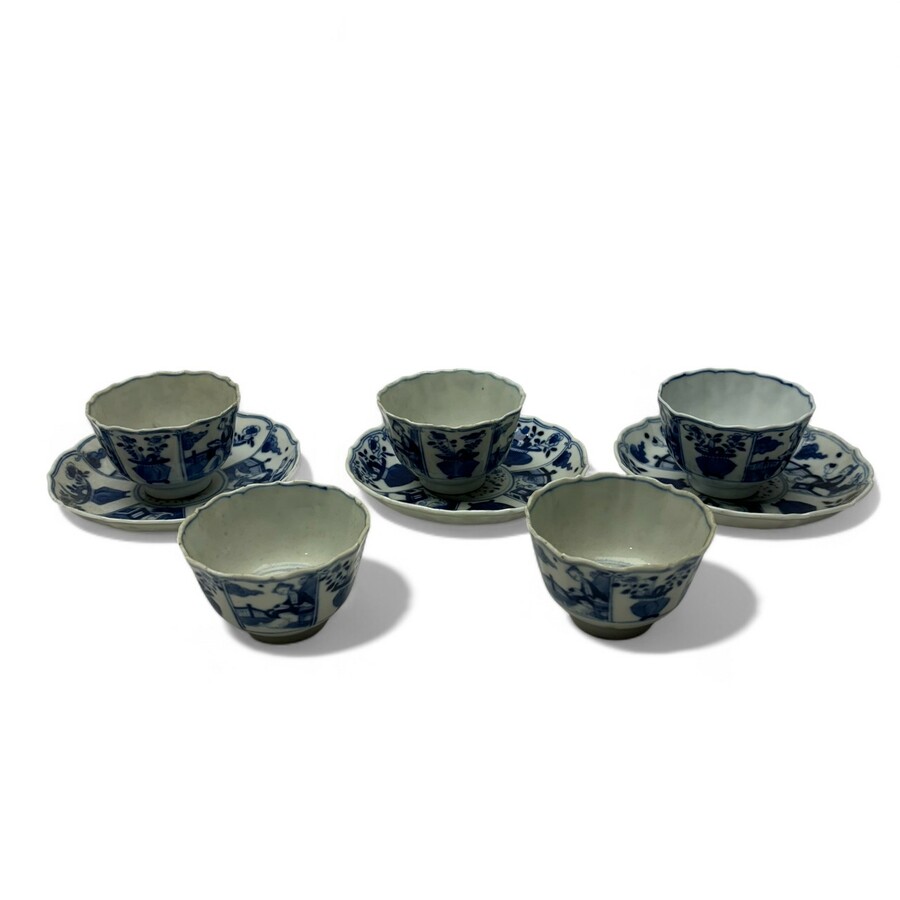 Lot van vijf 19e eeuwse Chinees porseleinen kopjes, met daarbij drie schotels. Met onderglazuur blauw-wit decor, vrouwstelling van een lijs met waaier op een terras, bloemenmanden en centraal ee...