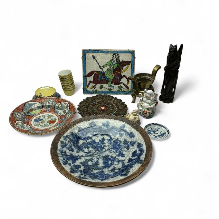 Lot divers Oosters & Aziatica, waaronder een Chinese blauw-witte Nanking schotel, Qajar tegel met voorstelling van ruiter te paard, 19e eeuwse Japanse schotel, messing schaaltje met turkoois...