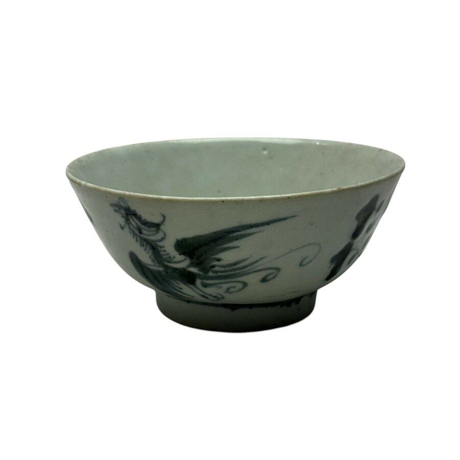 Een antieke 18e of 19e eeuwse Chinees porseleinen kom, met onderglazuur blauw decor van een fenix. Voor de Indonesische markt. Gemerkt met karakters.