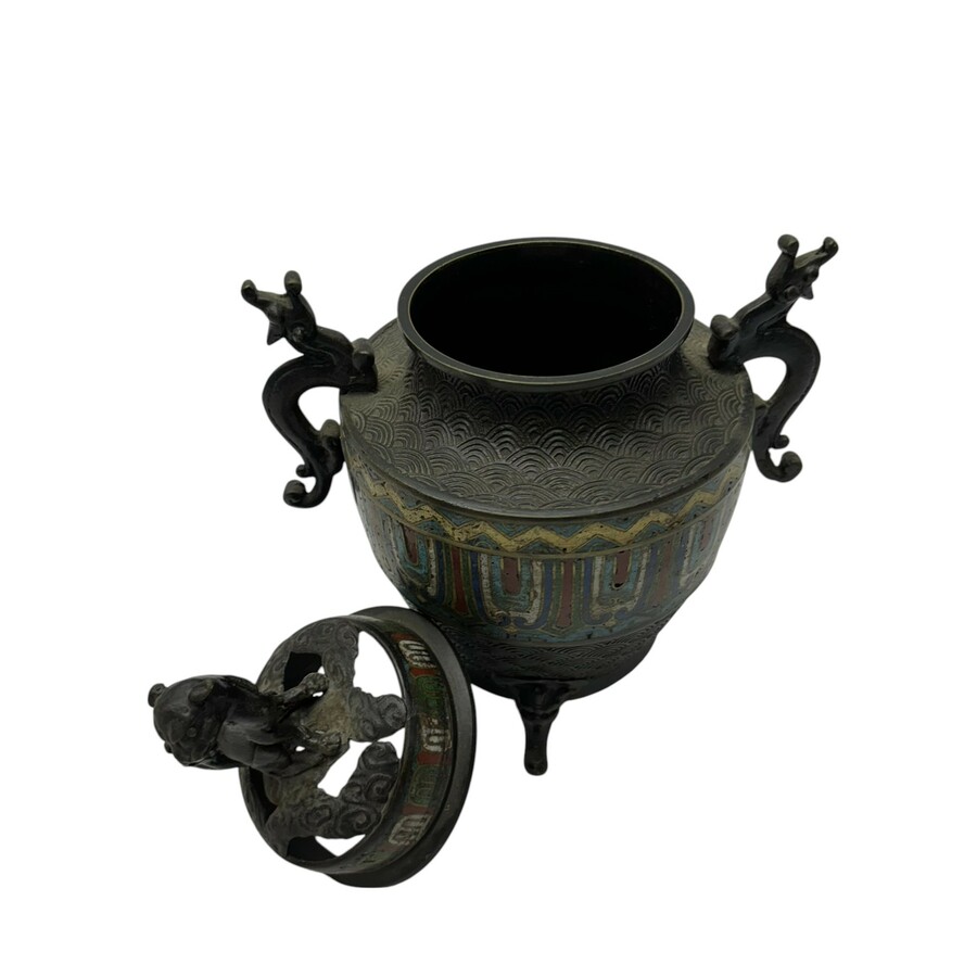 Een antieke cloisonné koro of wierookbrander. Geplaatst op drie pootjes, met twee oren en opengewerkte deksel, bekroond met foo dog.