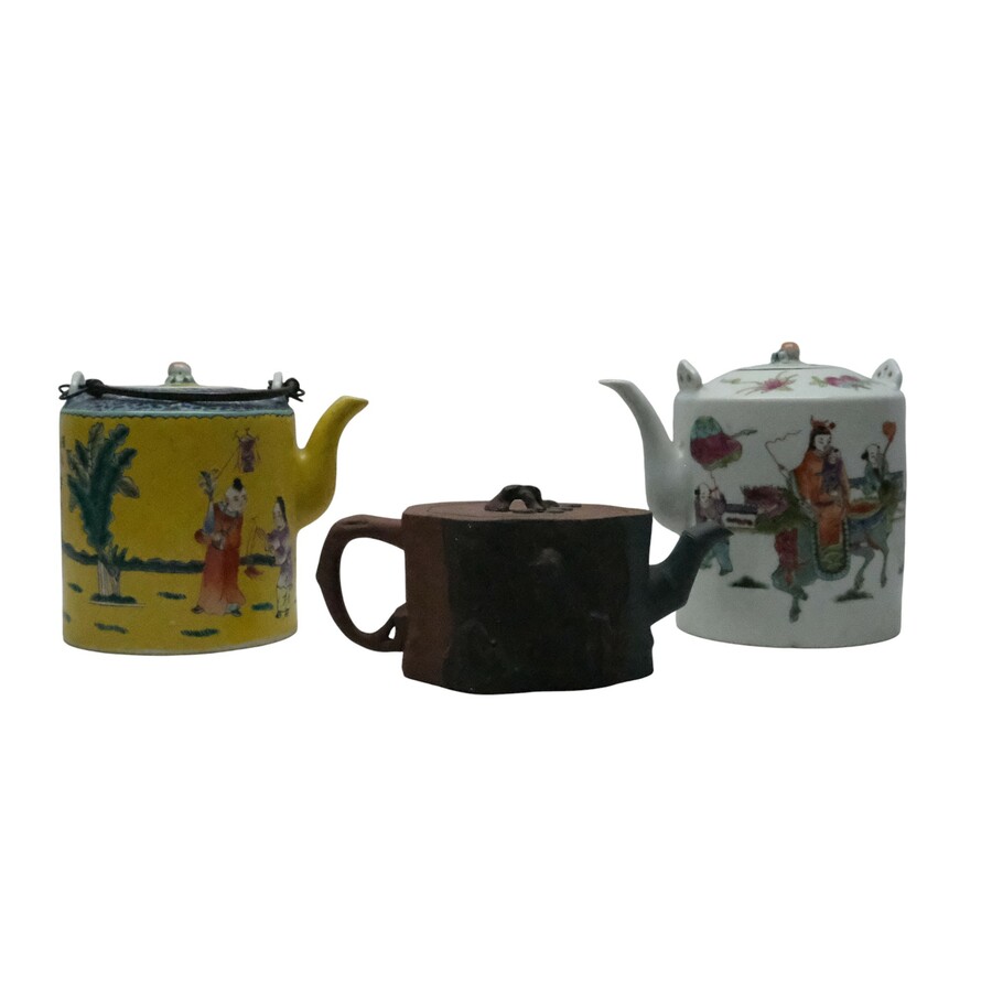 Lot van drie Chinese theepotten, twee porseleinen en één Yixing klei.