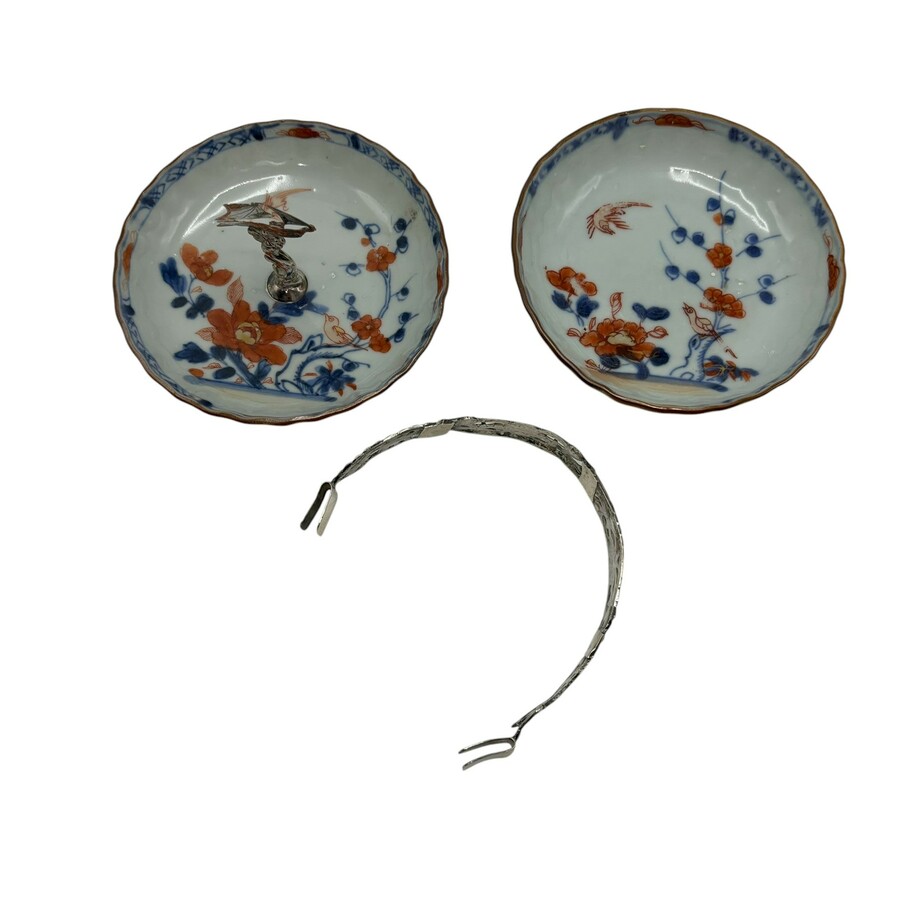 Lot van twee 18e eeuwse Chinees porseleinen schoteltjes, één schaaltje met in het midden een tweede gehalte (835/1000) zilveren greep, zeilschip. en één met tweede gehalte (835/1000) zilveren be...