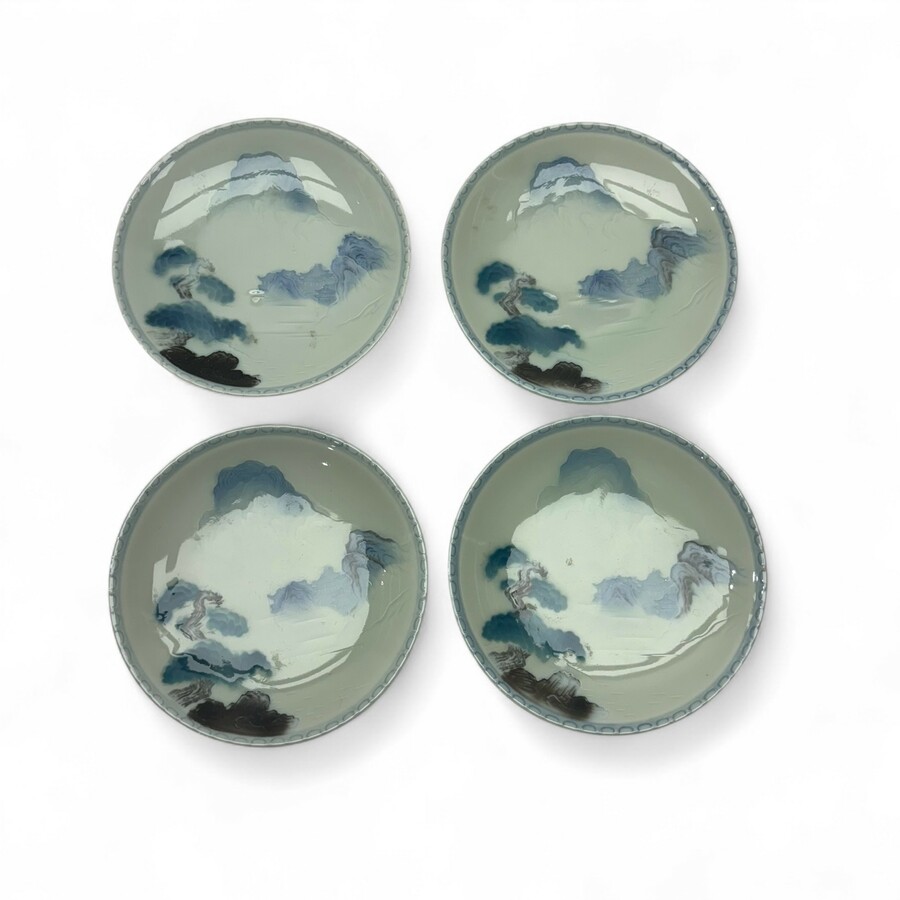 Vier Japans porseleinen schotels, 16 cm doorsnede. Blauw tinten en grijs met scrafitto landschappen met rotsen, rivier, naaldboom en pagode