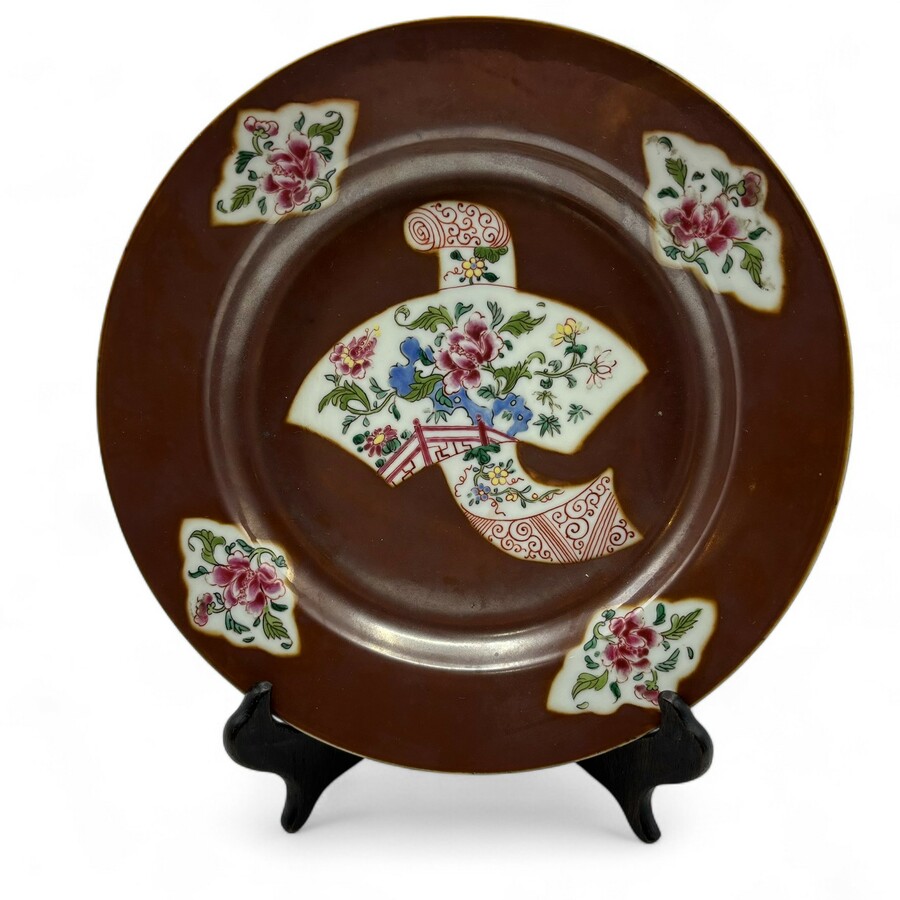 Een Chinees porseleinen Qianlong periode Famille rose capucijner schotel. Met een Famille Rose decor van een scroll en waaijer met florale decors op een capucijner fond.
