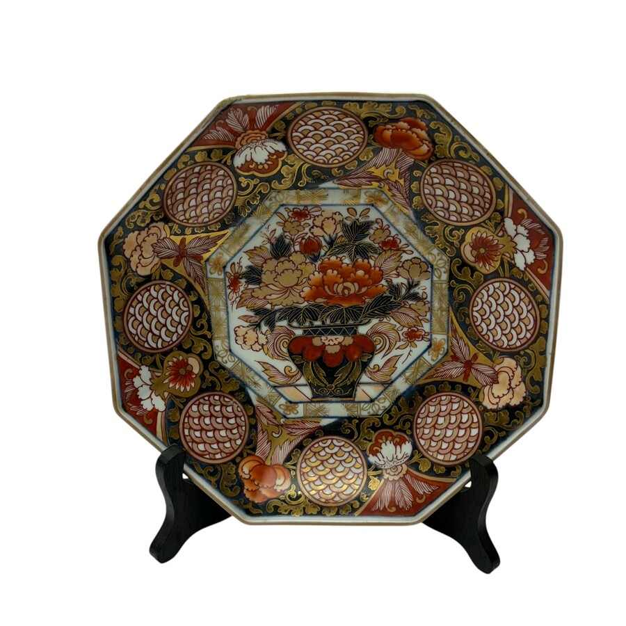 Een antieke 18e eeuws Japans porseleinen bord met imari decor. Zeskantig model met medaillons op de rand en bloemenmand op het plat.