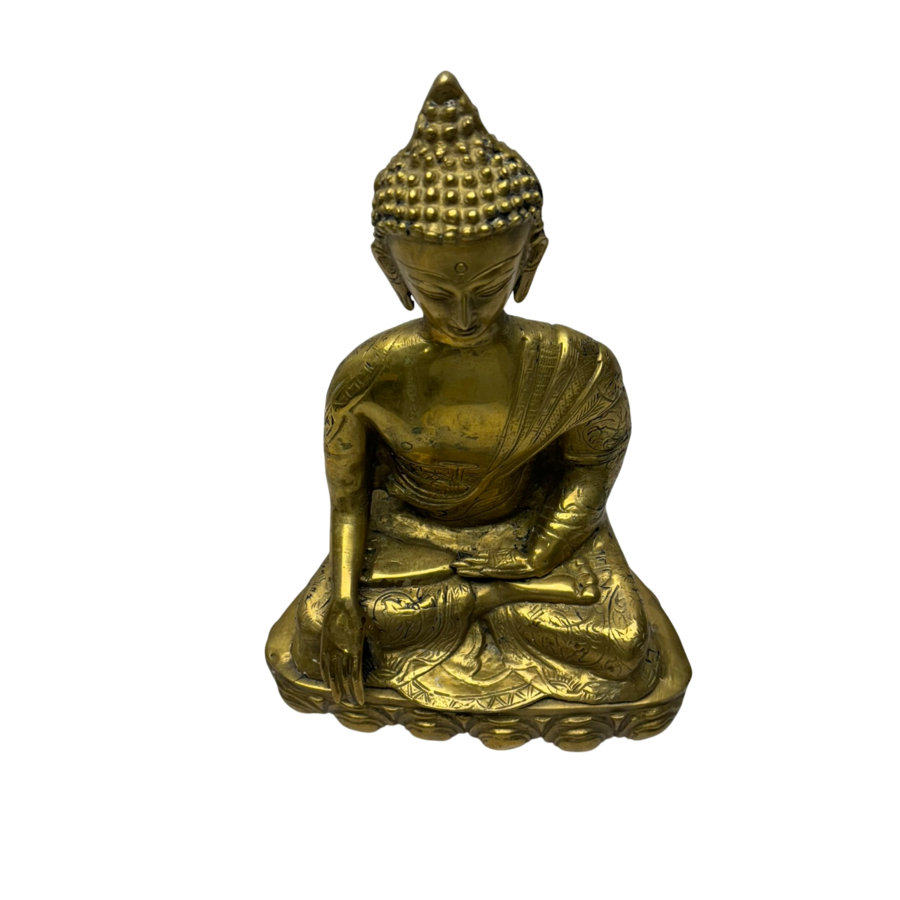 Een 20e eeuwse Tibetaanse bronzen Boeddha, zittend op lotusbladeren.