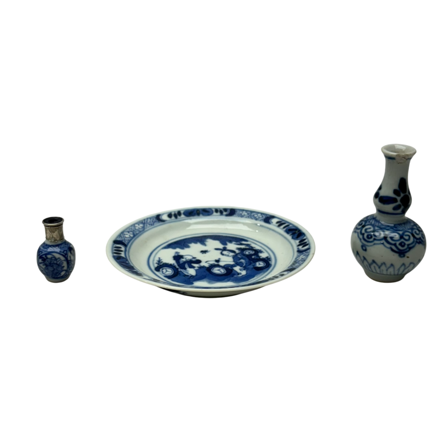 Lot Chinees porselein: een 18e eeuws miniatuur knobbelvaasje, een Kangxi vierkant miniatuurvaasje met zilveren hals en een 19e eeuws schoteltje met decor van lijs en zotje.