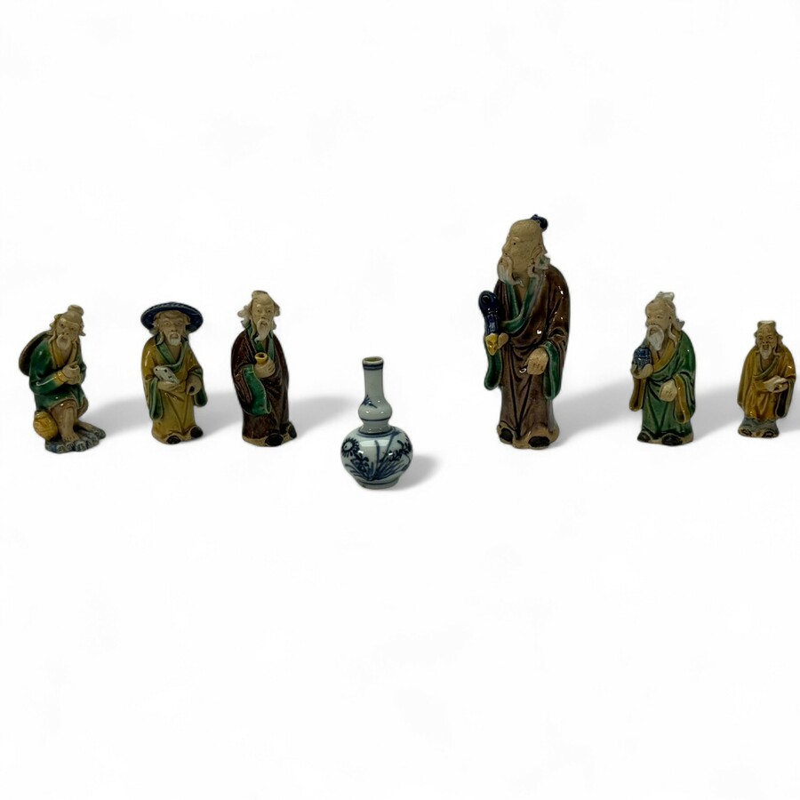 Lot van zes 20e eeuwse Shiwan figuren, met daarbij een 18e eeuwse poppenhuisvaasje