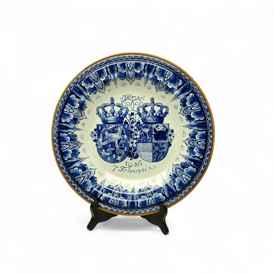 Een Delfts blauwe gelegenheids schotel 1901-1926, 25 jarige huwlijk tussen Koningin Wilhemina en Prins Hendrik. Gemerkt voor de Porceleyne fles, Delft. Jaarletter voor 1926.