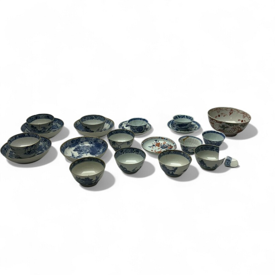Lot 18e eeuws Chinees porselein. Bestaand uit elf kopjes en zeven schoteltjes met diverse decors. Hierbij een Amsterdamse school kom met een decor van de kersenplukker.