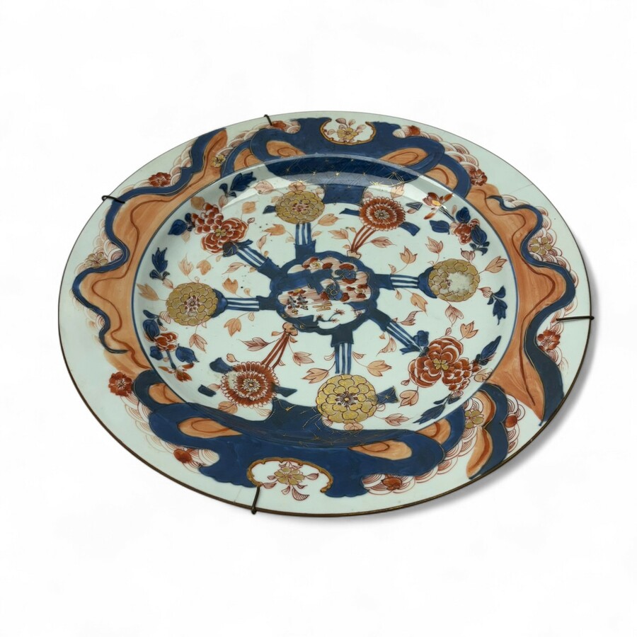 Een antiek 18e eeuws Chinees porseleinen schotel, Kangxi periode (1662-1722), met onderglazuur blauw en bovenglazuur rood & goud decor. Van onder andere bloemen.