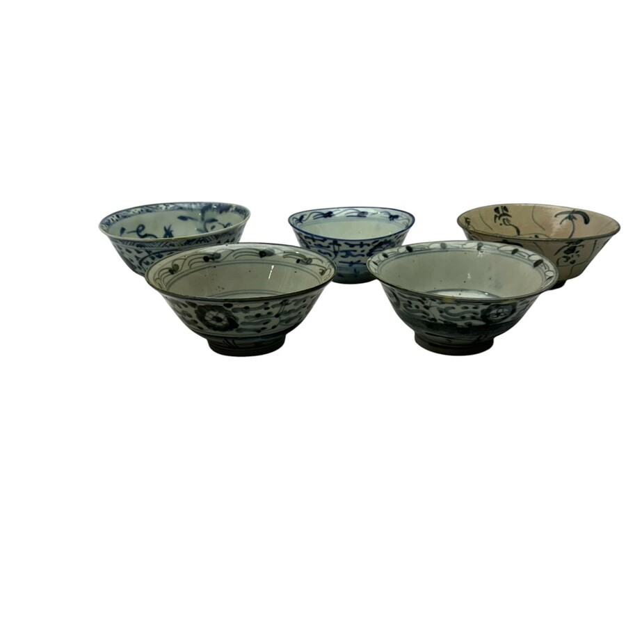 Lot van vijf Chinees porseleinen kommen. Vier Boerenming, met onderglazuur blauw decor. Eén Ming. Drie kommen gemerkt.