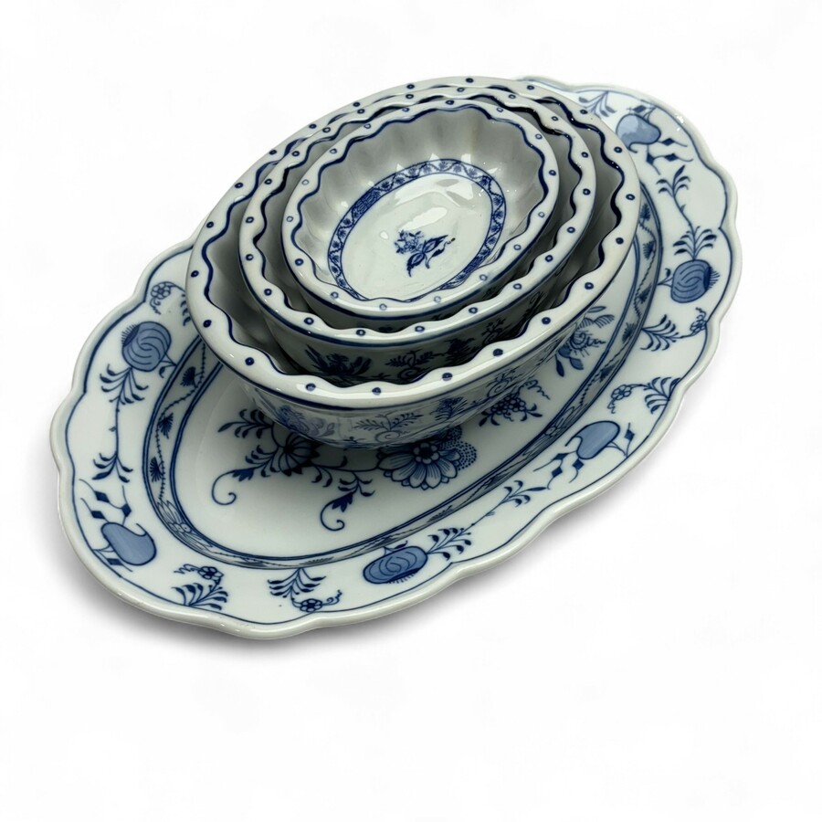Lot diverse porseleinen Swiebelmuster serviesdelen, Huttensteinach, Duitsland, waaronder een grote schaal, bordjes, een tazza etc.