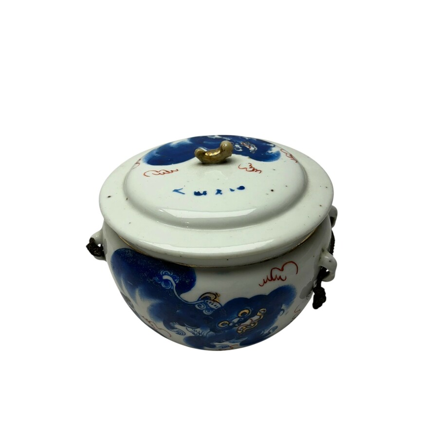 Een antieke 19e eeuwse Chinees porseleinen dekselpot met felblauwe beschildering van foo dog. Aan de onderzijde gemerkt met zegelmerk.