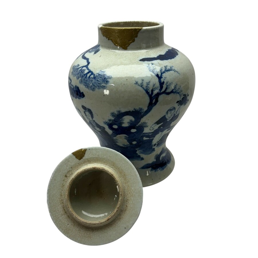 Een antieke Chinees porseleinen dekselvaas, ca. 1900. Balustervormig model met onderglazuur blauw-wit decor van zotjes en lijzen. Aan de onderzijde gemerkt met vierkaraktermerk.