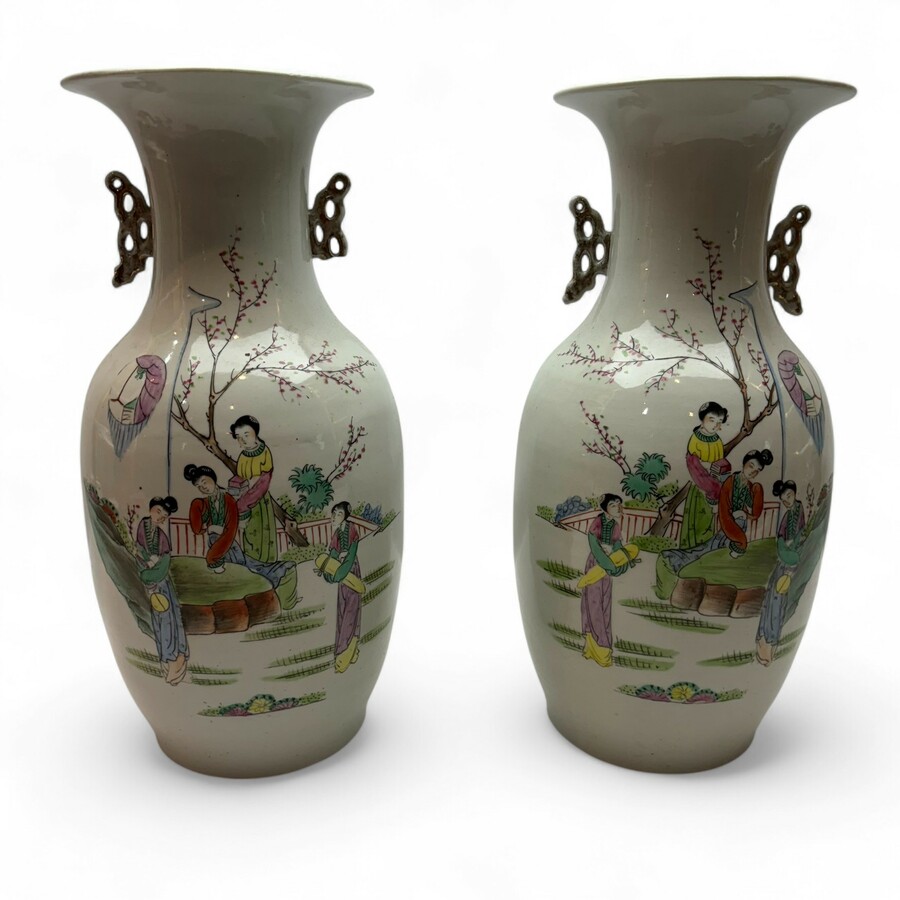 Lot van twee antieke 19e eeuwse Chinees porseleinen vazen, met decor van lijzen. Aan de onderzijde gemerkt.