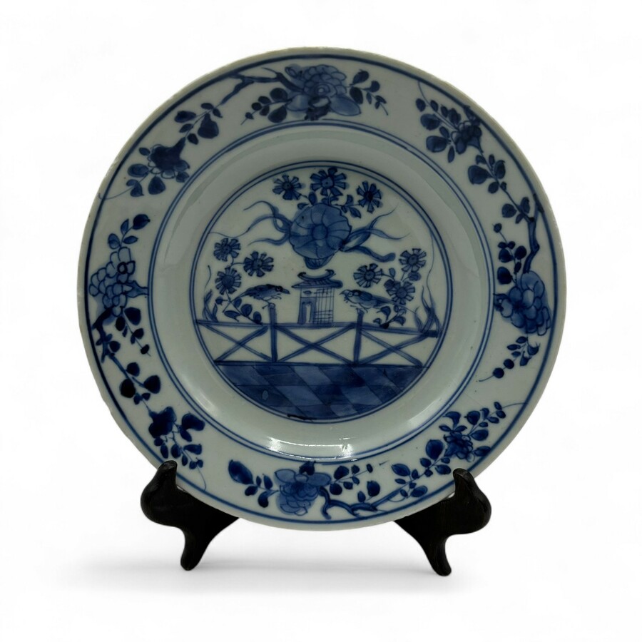Een antiek 18e eeuws Chinees porseleinen bord, onderglazuur blauw-wit decor, zgn 'cuckoo in a house'.