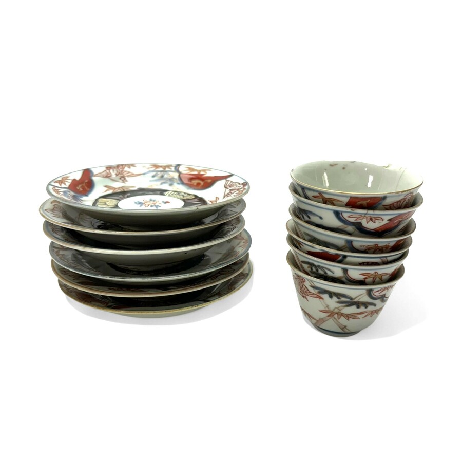 Zes porseleinen Japans 18e eeuwse Imari kop en schotels. Met decors van bloemen, vogels en zwarte accenten op de schotels. Edo periode.