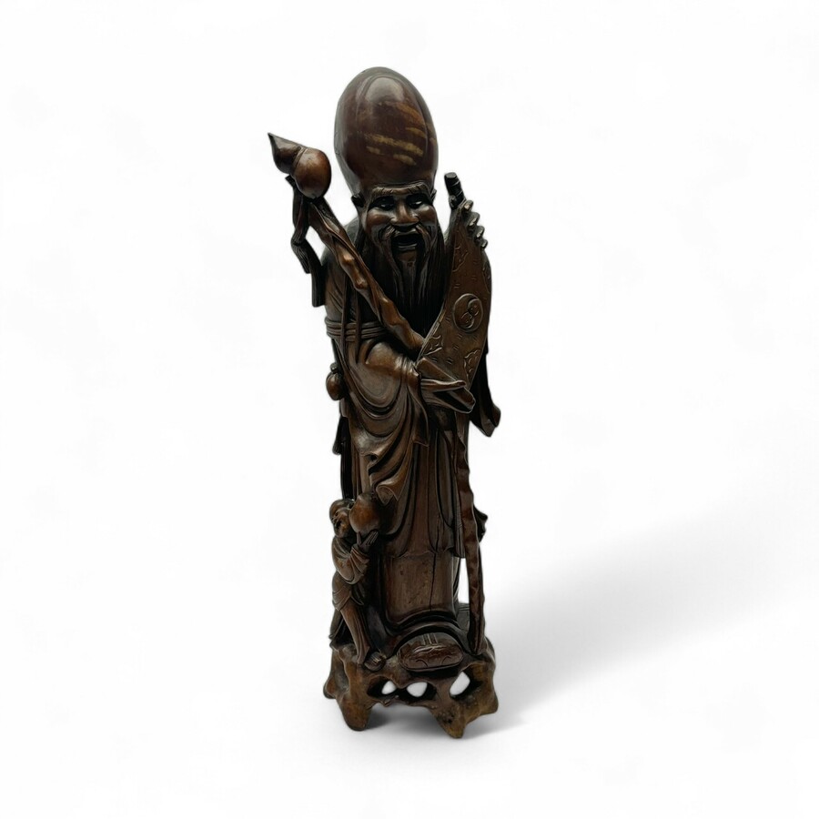 Een antieke Chinees hardhouten sculptuur van de onsterfelijke geleerde Lohan met staf en scroll. Met daarnaast een leerling/zotje met perzik.