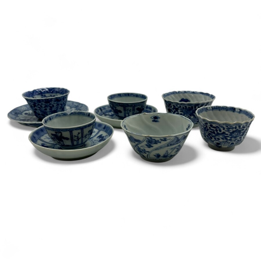 Lot met Chinees porseleinen KangXi en Qianlong periode kop en schotels, waarvan twee bijpassend. bestaande uit zes kopjes en drie schotels. Alles blauw/wit met diverse decors.