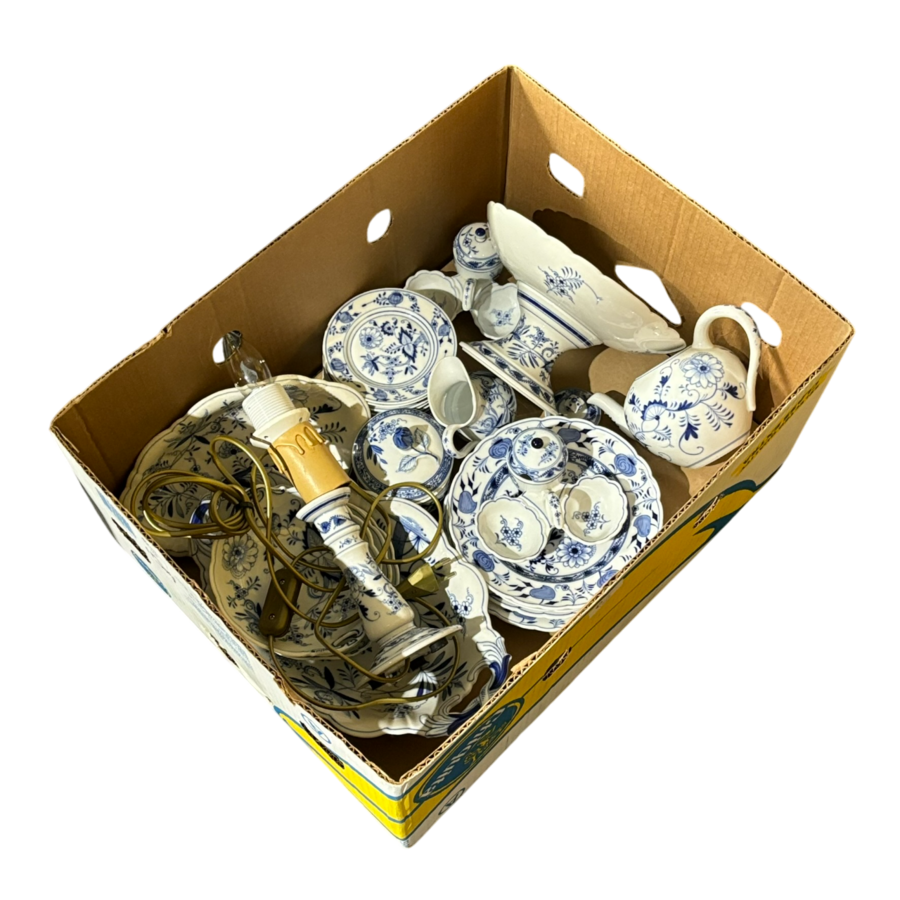 Lot divers 20e eeuws Zwiebelmuster porselein. Onder andere twee kandelaars, een soezenschaal en een taartschaal. Diverse makers, waaronder één schaal gemerkt Meissen.