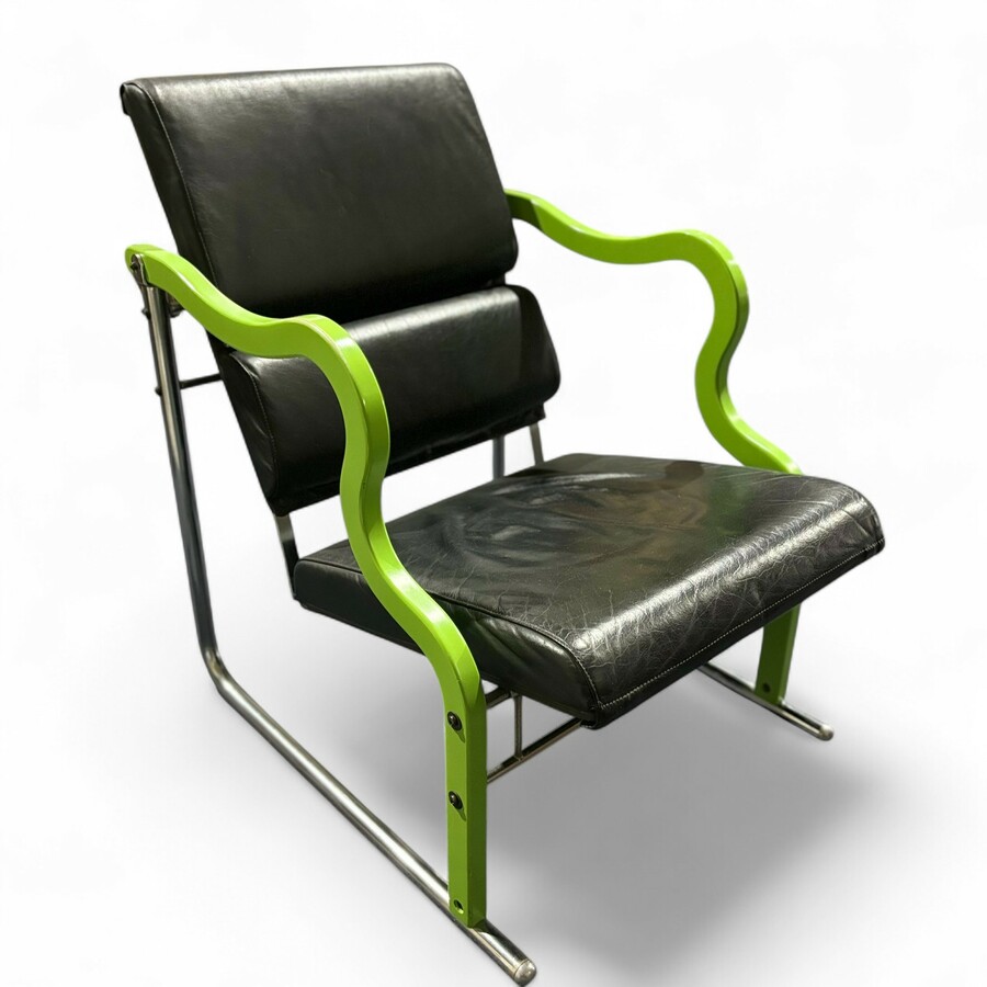 Een jaren '80 of '90 design fauteuil, zwart lederen bekleding met chroom & gelakt houten frame. Betreft de 'Experiment Chair', ontwerp Yrjö Kukkapuro voor Avarte, Finland (geproduceerd van 1...
