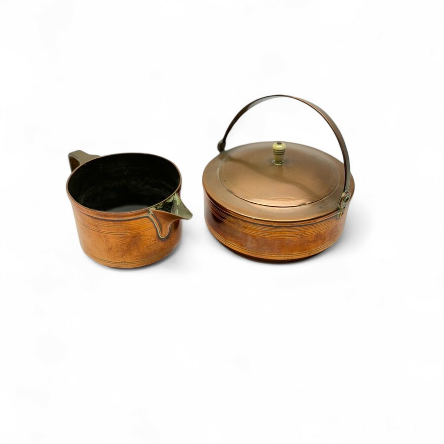 Een vroeg 20e eeuwse roodkoperen Nieuwe Kunst melkkan en suikerpot met hengsel. Beide gemerkt voor J.C. Stoffels, Onder den Sint Maarten, ca. 1905