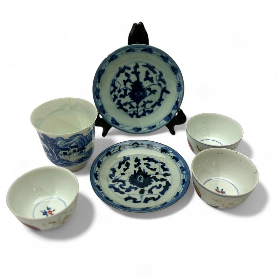 Lot divers Aziatisch porselein: twee 19e eeuwse Chinese schoteltjes, een 19e eeuwse Japanse kom en drie 18e of 19e eeuwse Japans imari kommen