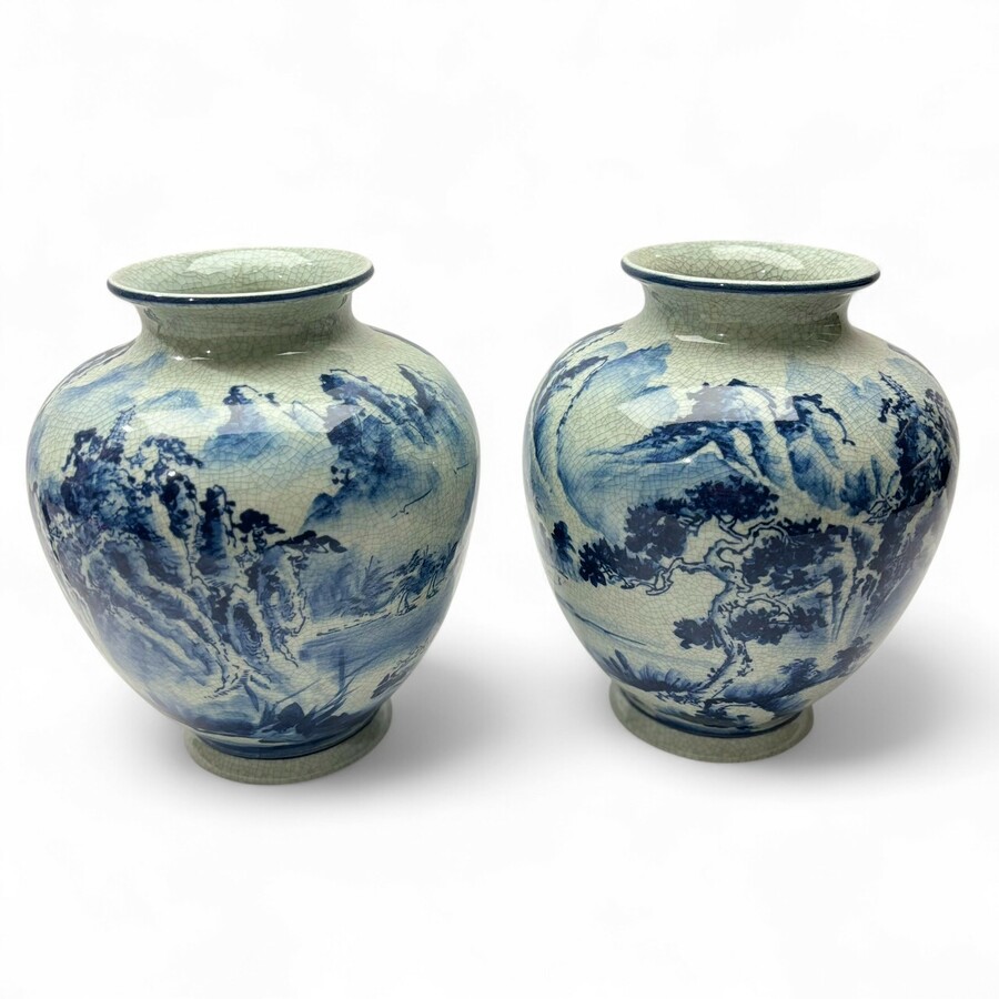 Lot van twee 20e eeuwse Oosterse vazen met decor van berglandschap en tempels