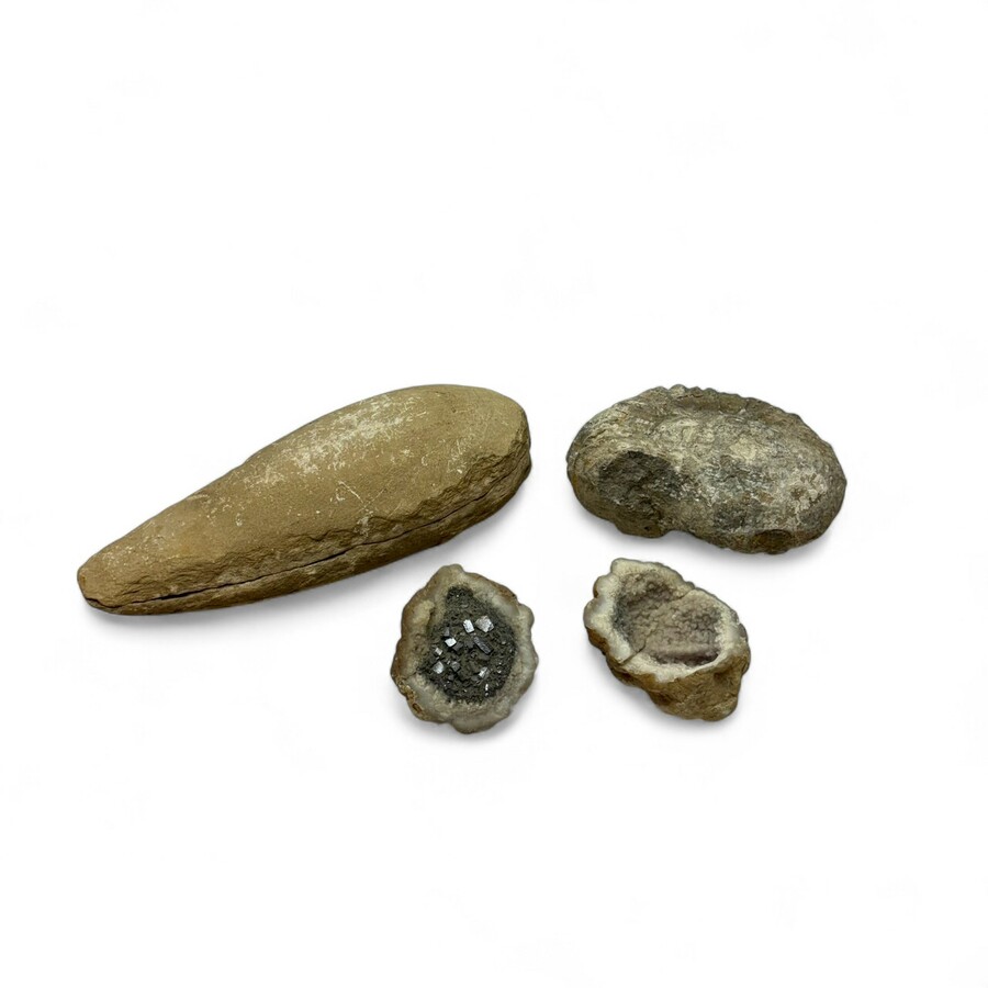 Lot stenen en fossielen: een ammoniet, steen in twee helften met gefossiliseerde vis en geode met vermoedelijk pyriet.