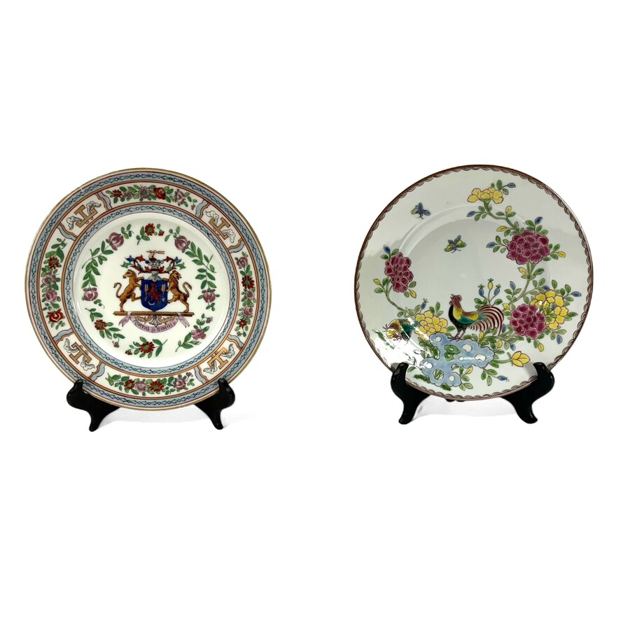Twee Frans porseleinen schotels naar Chinese voorbeelden, 22,5 cm doorsnede. Een famille rose hanen bord en een famille rose wapenschotel. Gemerkt voor Edmé Samson , ca 1900. Beide schotels gaaf...