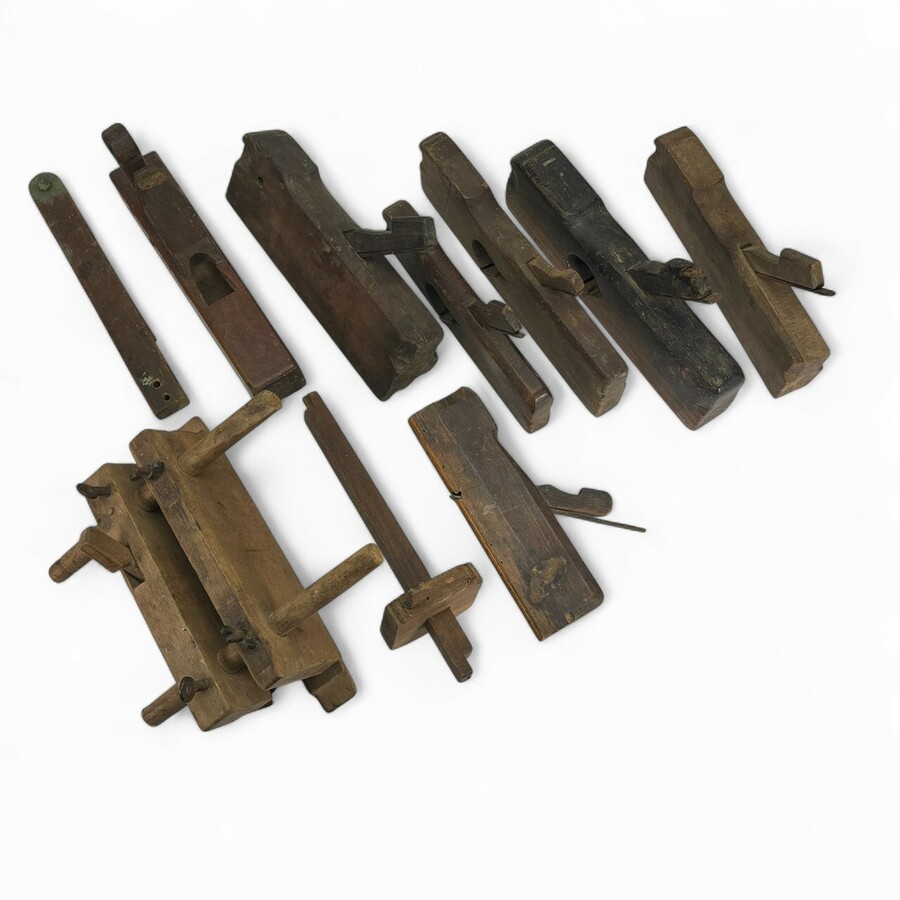 Een lot met diverse antieke houten gereedschap, waaronder diverse schaven. Vroeg 20e eeuws of ouder.