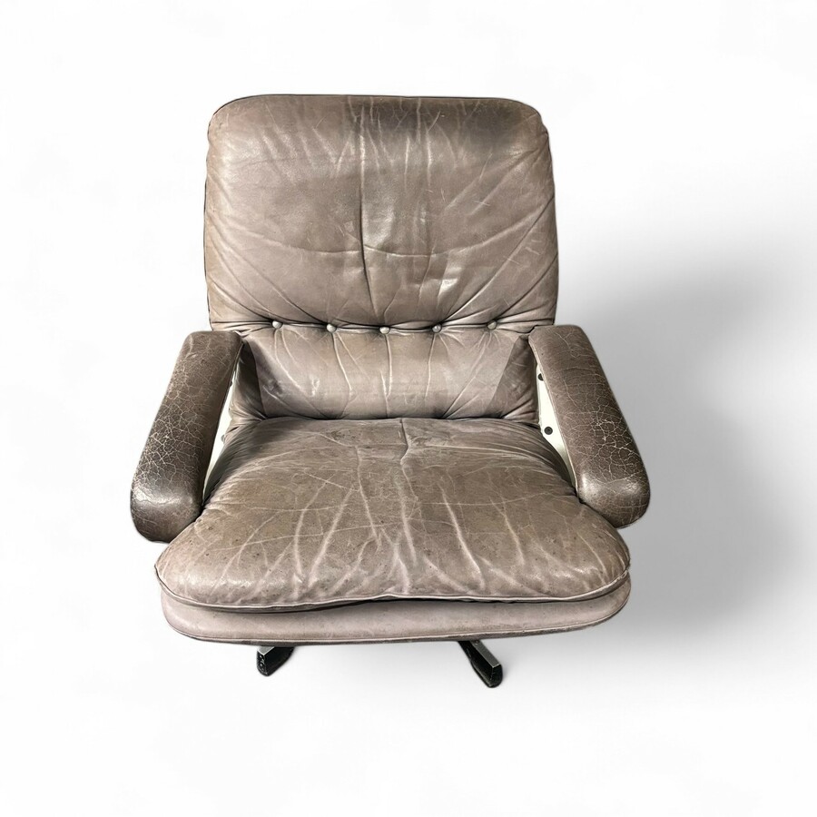 Een jaren ’70 fauteuil met grijs ledderen bekleding, in de stijl van Artifort.