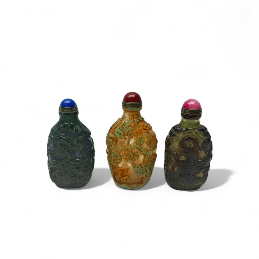 Drie Chinees Peking glazen snuffbottles. Met decors van vogels op takken, draak en feniks jagend op een vlammende parel. Met mineralen doppen en messing lepeltjes.
