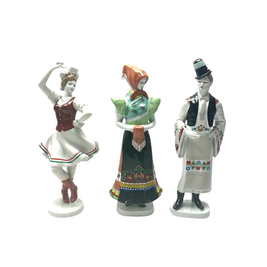 Drie Hongaarse Hollohaza porseleinen sculpturen. Een stel in traditionele kleding en een balletdanseres. tweede helft 20e eeuws.