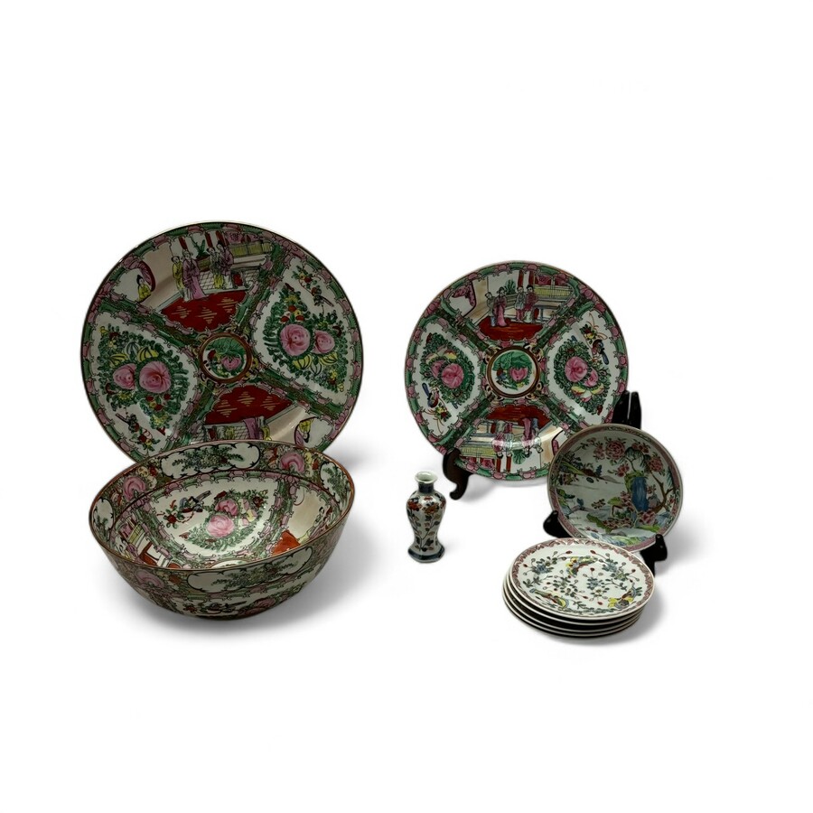 Lot met Chinees en Japans porselein. Bestaande uit twee kantonese schotels en een kom, vijf Japanse schoteltjes. Een 18e eeuws Famille rose schoteltje en een Imari miniatuur vaasje.