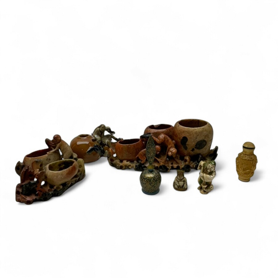 Lot met diverse Oosterse artikelen. Bestaand uit gestoken speksteen, snuffbottle, brushwasher, en Netsuké, visser met vis.