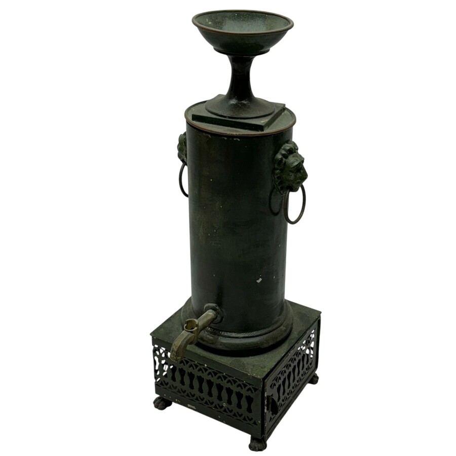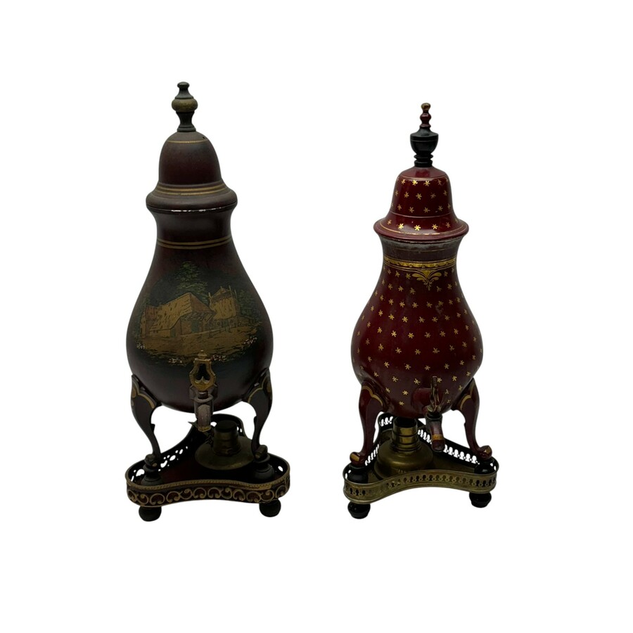 Twee beschilderde koperen kraantjeskannen: één met goudkleurig sterretjesdecor, en één met polychroom beschilderde voorstelling van boerderij, beide op onderstel, 19e eeuw