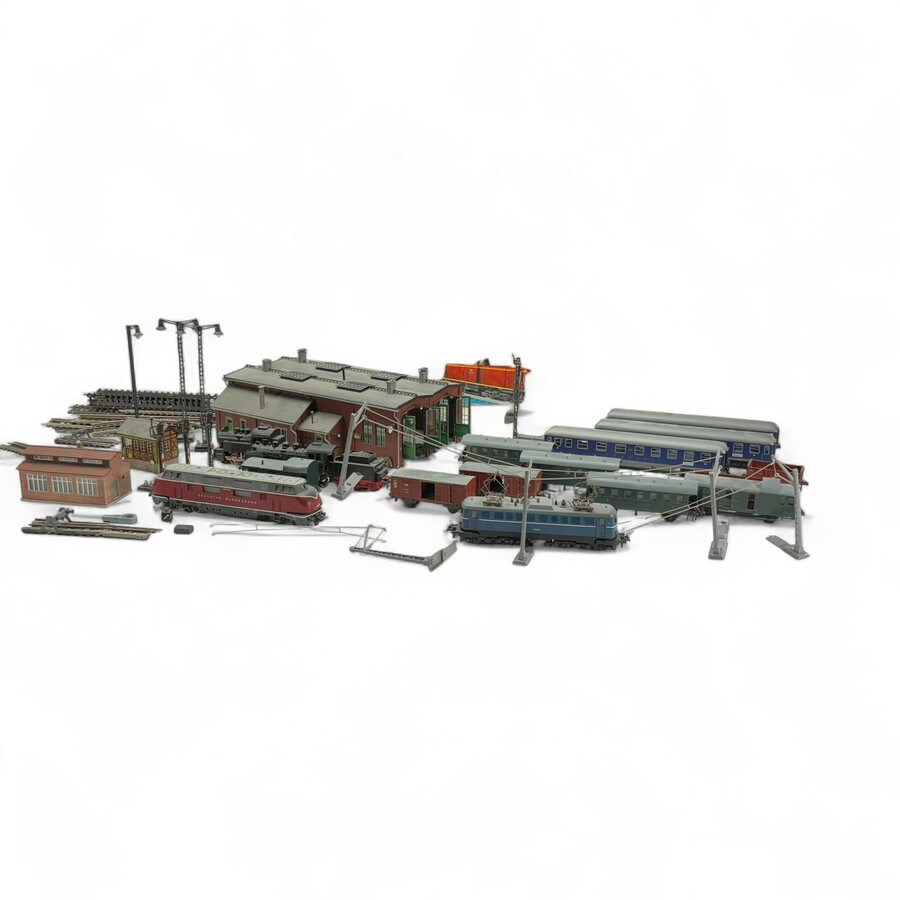 Lot speelgoedtreintjes, Trix, waaronder spoor, bovenleidingen, enkele kunststof Vollmer huisjes, gebruiksaanwijzing Trix 1964, wagons en vier locomotieven
