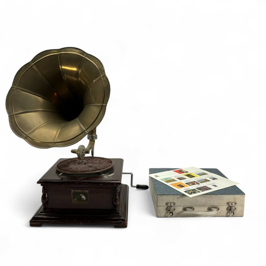 Een 20e eeuwse grammofoonspeler, His masters Voice, met koperen hoorn. Met daarbij een koffer met 78-toeren platen