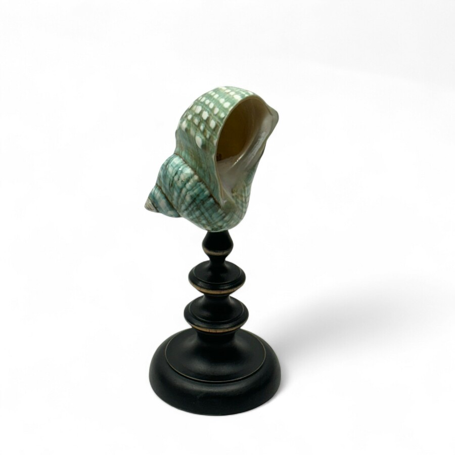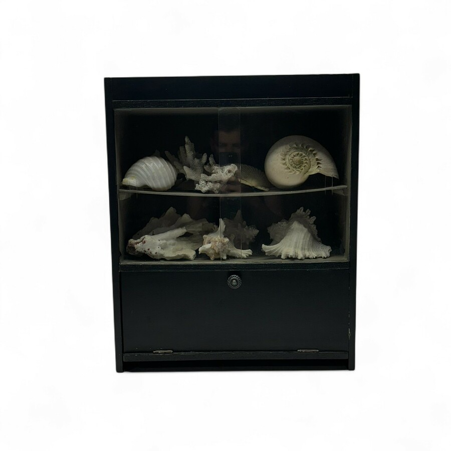 Een 20e eeuws zwart hangvitrinekastje met glazen deurtjes , gevuld met schelpenverzameling