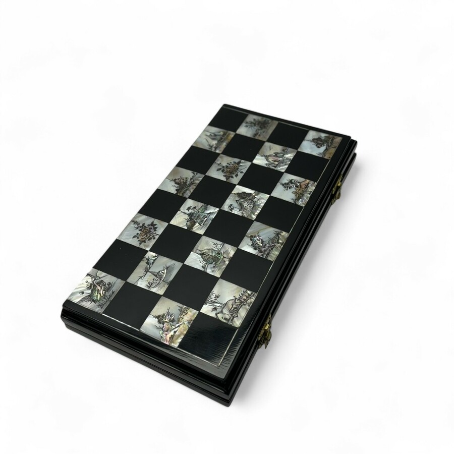 Een 20e eeuws schaakspel, ingelegd met parelmoer. Bewerkt met oosterse voorstellingen. Met daarbij gedraaide houten schaakstukken.