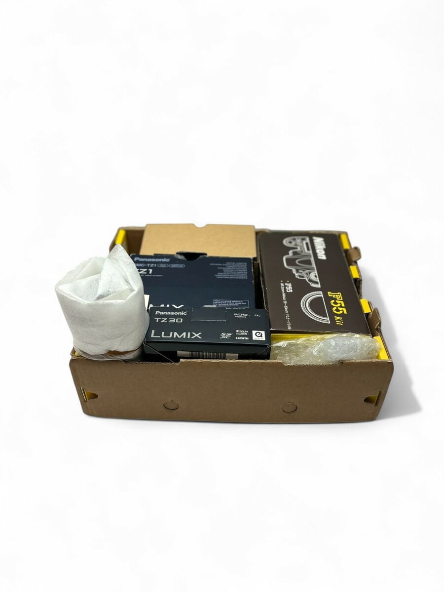 Lot fotocamera's en toebehoren: Nikon F55 met Nikkor 28-80mm kitlens en Nikkor 70-300mm zoomlens, een Lumix TZ 30 digitale camera en een Lumix DMC-TZ1 digitale camera